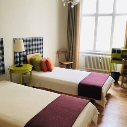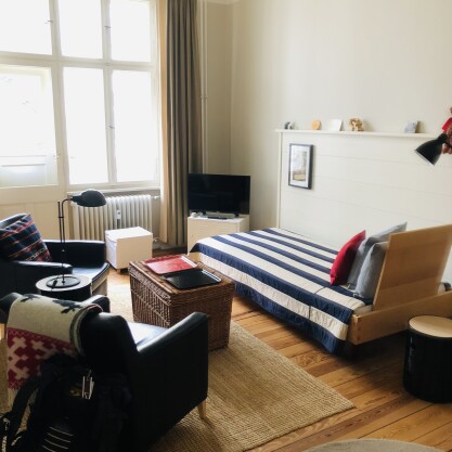 Im Wohn- und im Schlafzimmer und auch im Flur wurden die Wände mit Marmorfaserputz verputzt und Decken und Wände mit Kaseinmarmormehlfarbe gestrichen. Die ursprünglichen Dielenböden blieben erhalten. Badezimmer und Küche sind mit Kalkglätte verputzt, mit Sumpfkalkfarbe gestrichen und wasserfest mit spanischer Olivenseife geseift. Die Küche erhielt einen Linoleumboden, für das Verlegen der Wand- und Bodenfliesen in Küche und Bad wurde ein ökologischer Fliesenkleber verwendet. Für das Abdichten diente ein Sanitär-Silikon auf Wasserbasis. Es hat keine Möbel in der Wohnung, die Spanplatten enthalten. Die Betten sind aus Massiv-Buche und metallfrei. Auch alle Tische, Stühle und Schränke sind aus Vollholz gefertigt. Der Küchenblock ist aus Edelstahl.